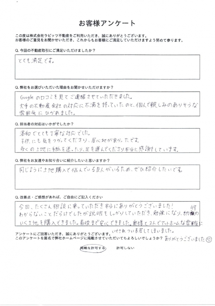 この度は、無事土地のお引渡しが終わり、ホッとしています! お出会いしてから、ちょうど半年になりますね! 密に連絡を取り、何度もお会いしたので、もっともっと長く感じます。 今日、この日を笑顔で迎えられて、こちらとしても本当に嬉しいです。 この土地で素敵な美容室をオープンされることを願っております。 完成しましたら、是非遊びに行かせてくださいね(^^)/ お手伝いさせていただけて本当に幸せでした、おめでとうございました!